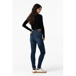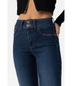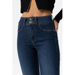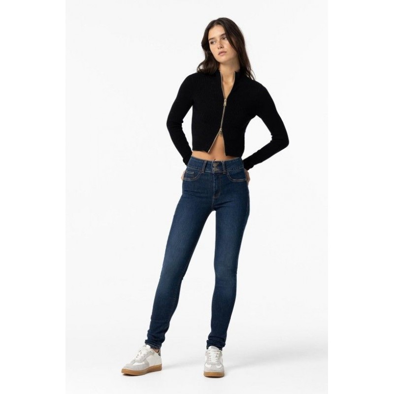 Pantalón One Size Double Up 104 de la marca Tiffosi. Pantalón de talla única con tiro alto y en color vaquero oscuro desgastado con detalle de logo de la marca en la parte trasera al lado de la trabilla en cristalitos. Se adaptan al cuerpo a la perfección y está confeccionado con un tejido que no queda cedido tras su uso, es decir, vuelve a su ser. Dispone de cierre frontal con cremallera y doble abotonadura. Con falsos bolsillos delanteros.