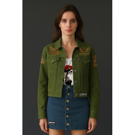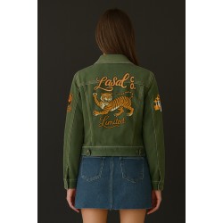 <p>Cazadora exclusiva de mujer Pilot Kaki de la marca LASAL. Cazadora vaquera en color kaki con bolsillos laterales abiertos y centrales con cierre de botón. Lleva varios bordados en color dorado en la prenda, tanto en pecho, como en mangas y un maxi bordado en la espalda. Como no podía ser de otro modo uno de los bordados corresponde a la numeración aleatoria de la marca que garantiza que únicamente hay 100 unidades de la misma y el logo de la firma engomado que avala la autenticidad de la prenda.</p>