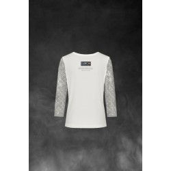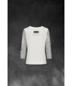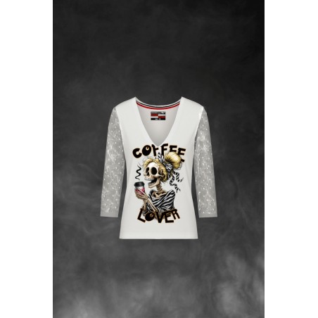 Camiseta exclusiva de mujer Coffee Love Blanca. Camiseta en color blanco, con cuello pico y mangas 3/4 de gasa semitransparente.