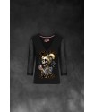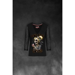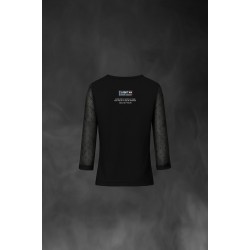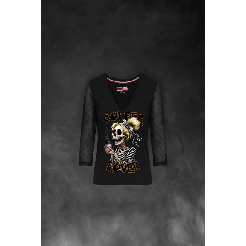 Camiseta exclusiva de mujer Coffee Love Negro. Camiseta en color negro, con cuello pico y mangas 3/4 de gasa semitransparente.