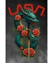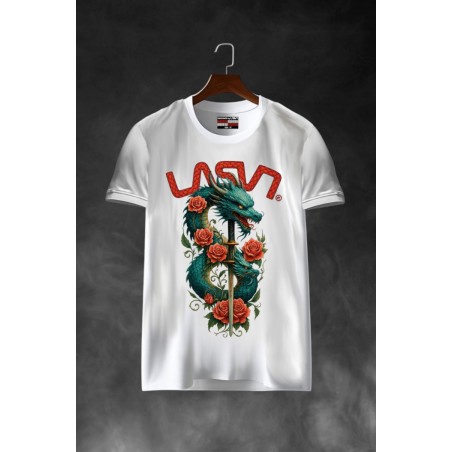 Camiseta Chico LASAL Draco Blanco. Camiseta regular fit, de manga corta y cuello redondo, en color blanco, con ilustración frontal de un dragón junto a una espada y cubierto de rosas rojas.