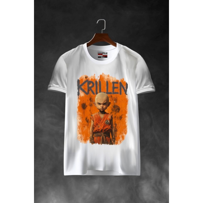 Camiseta Chico LASAL Krillen Blanco. Camiseta de manga corta y cuello redondo, en color blanco, con ilustración frontal de la serie Dragon Ball con el personaje de Krillen sobre un fondo naranja.