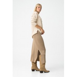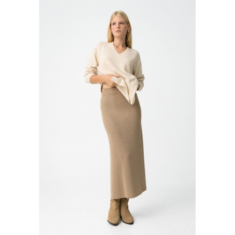 Falda Cassia B PortabellaTiffosi. Falda midi con base en color crudo e hilo metálico insertado que le aporta un brillo muy original. Cintura elástica y bajo con abertura.