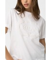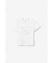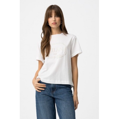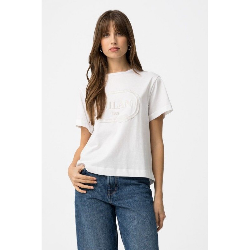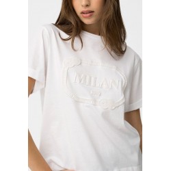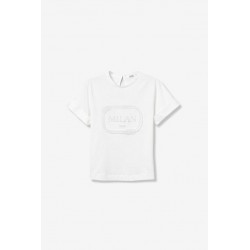 Camiseta Spacy Blanca Tiffosi. Camiseta básica blanca con cuello redondo y manga corta con dobladillo. Lleva en relieve en el frontal la palabra Milán enmarcada y el la parte posterior cierre de botón al cuello con escote en lágrima bajo el cual lleva tres franjas horizontales en relieve.