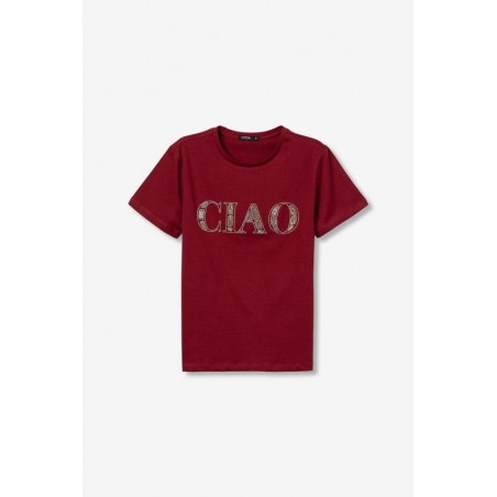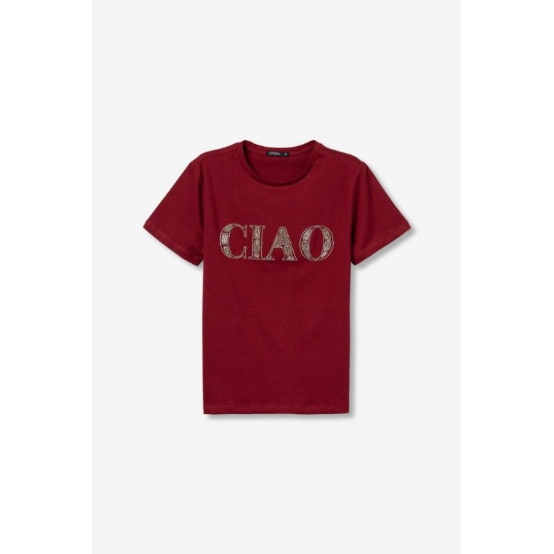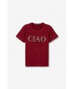 Camiseta Bilu Rojo Tibetano Tiffosi. Camiseta básica roja con cuello redondo y manga corta. Con la palabra "Ciao" cosida con perlitas en el frontal.