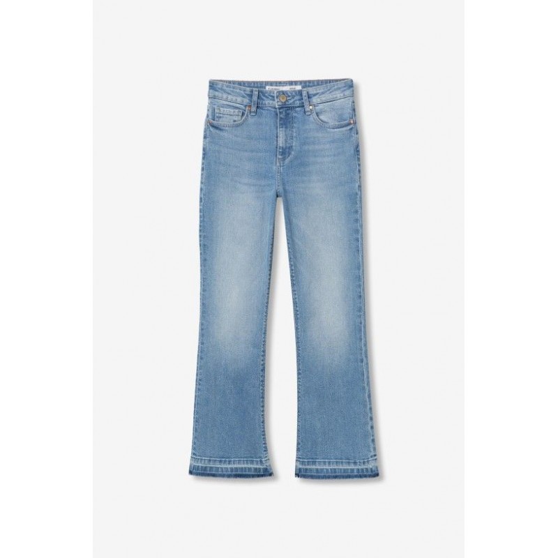 Pantalón Megan 124 Vaquero Claro Tiffosi. Pantalón vaquero claro de corte cropped flare. Dispone de cinco bolsillos y de cierre de botón con cremallera.