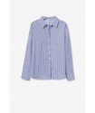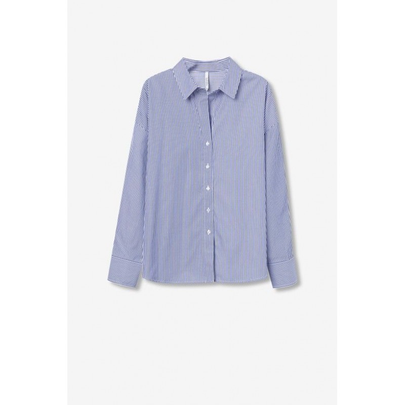 Camisa Nancy 1 Azul Marino Tiffosi. Camisa de botones y cuello pico con solapa. De rayas verticales finas en azul marino con blanco. Puño ancho.