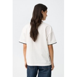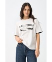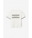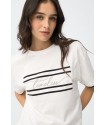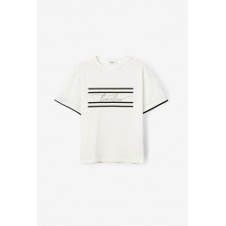 Camiseta Milos Blanca Tiffosi. Camiseta de cuello redondo y manga corta hasta el codo, en color blanca con palabra "timeless" en frontal encuadrada con rayas horizontales en negro. Raya negra tambiñen en el final de la manga.
