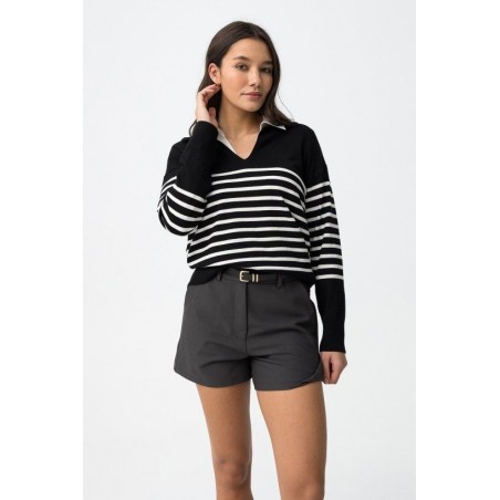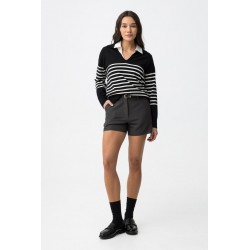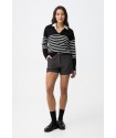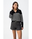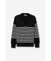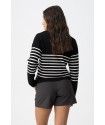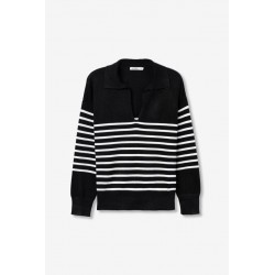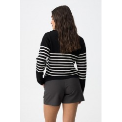 Jersey Vernon Negro Tiffosi. Jersey de estilo marinero con cuello pico y solapa en color negro con rayas blancas horizontales en la zona central del cuerpo y mangas.