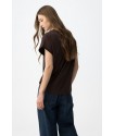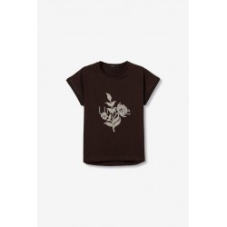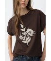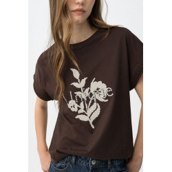 Camiseta Natalie Chocolate Tiffosi. Camiseta básica blanca con cuello redondo y manga corta con detalle y con estampado floral beige con tachas"unique" en el frontal .