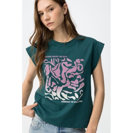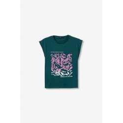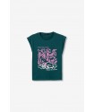 Camiseta Numel Verde Tiffosi. Camiseta en color verde con cuello redondo y manga sisa, con detalle de ilustración delantera en "caviar" rosa y blanco.