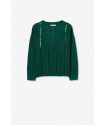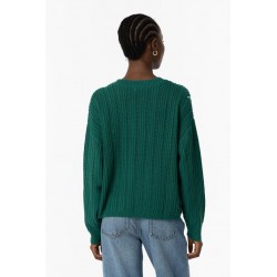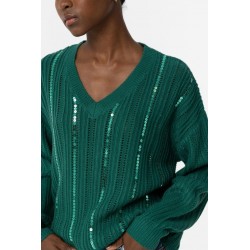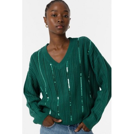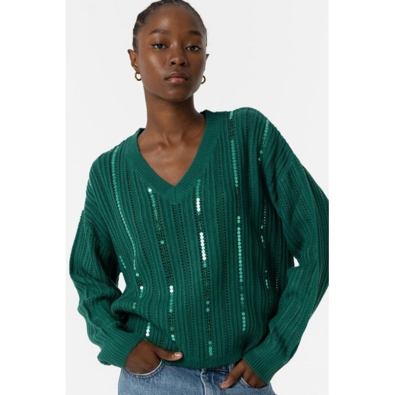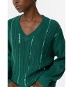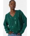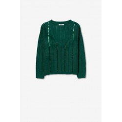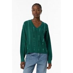 Jersey Fynodere Azul Tormenta Tiffosi. Jersey de punto en color verde con escote en pico y manga larga. Dispone de lineas verticales de lentejuelas del mismo tono del jersey distribuídas por todo el tronco y que le aportan un brillo muy original.