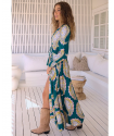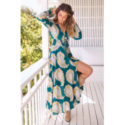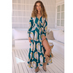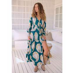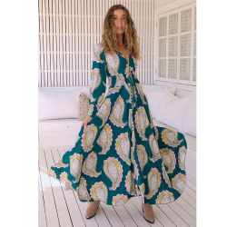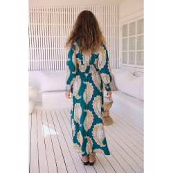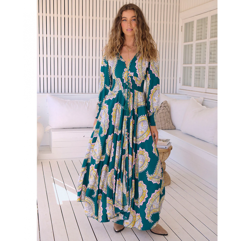 Vestido Palamos Romi de Jaase. Vestido largo con base en color rosa empolvado y estampado tipo paisley en tonos verdes y naranjas.
