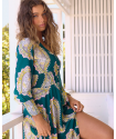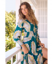 Vestido Sunseeker Tracey de Jaase. Vestido corto con manga tipo amapola, de color azul y estampado de flores en tonos naranjas.