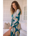 Vestido con manga hasta la zona del codo y escote pico. Botones hasta la zona de la cinturilla en nido de abeja y abertura en la zona baja del vestido. Incluye cordon a modo de adorno en la zona de la cintura.