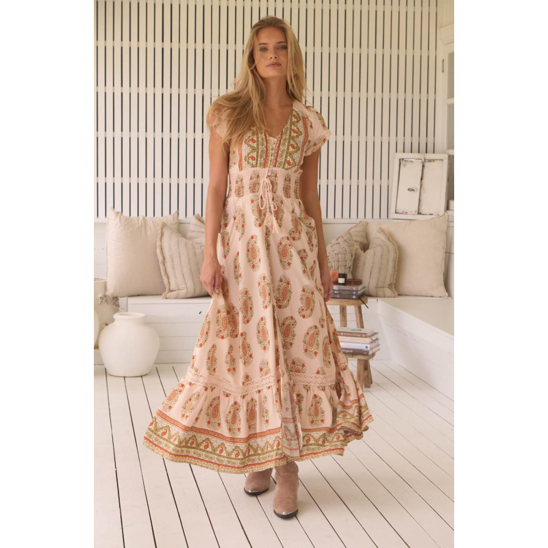 Vestido Palamos Romi de Jaase. Vestido largo con base en color rosa empolvado y estampado tipo paisley en tonos verdes y naranjas.