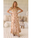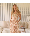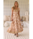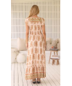 Vestido Long Island Indiana de la marca Jaase. Vestido con estampado combinado a franjas amplias en tono crudo y coral, estampado con estrellas de mar y conchas de color dorado / ocre y azul.