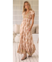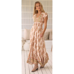 <p>Vestido Palamos Romi de Jaase. Vestido largo con base en color rosa empolvado y estampado tipo paisley en tonos verdes y naranjas. </p>