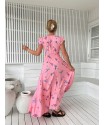 Vestido de manga corta en volante y escote en pico que favorece mucho. Lleva botones hasta la zona de la cinturilla que es fija y se entalla con un cordon interior. Lleva un volante en la zona del bajo para dar mas vuelo a la falda.