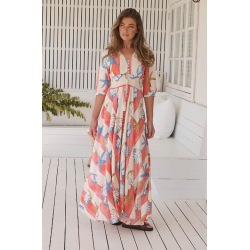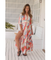 <p>Vestido Long Island Indiana de la marca Jaase. Vestido con estampado combinado a franjas amplias en tono crudo y coral, estampado con estrellas de mar y conchas de color dorado / ocre y azul. </p>