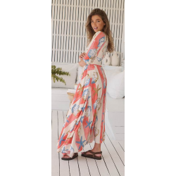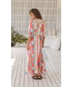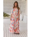Vestido Palamos Romi de Jaase. Vestido largo con base en color rosa empolvado y estampado tipo paisley en tonos verdes y naranjas.