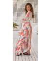 Vestido Long Island Indiana de la marca Jaase. Vestido con estampado combinado a franjas amplias en tono crudo y coral, estampado con estrellas de mar y conchas de color dorado / ocre y azul.