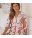 Vestido de manga corta en volante y escote en pico que favorece mucho. Lleva botones hasta la zona de la cinturilla que es fija y se entalla con un cordon interior. Lleva un volante en la zona del bajo para dar mas vuelo a la falda.
