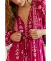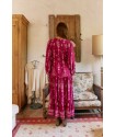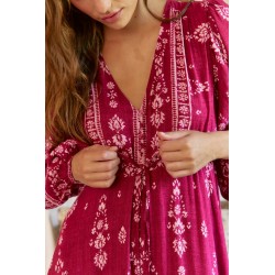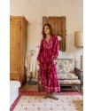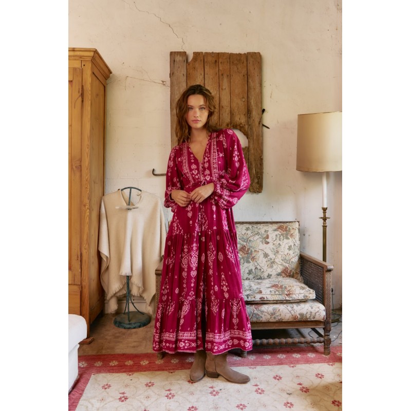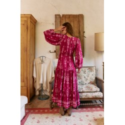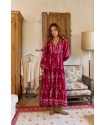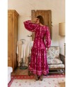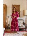 Vestido Rhubarb Teresa de Jaase. Vestido de manga larga y largo hasta los pies. La base va en color granate y esta estampado en tono rosa que le aporta mucha alegria a este vestido de otoño-invierno.