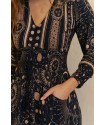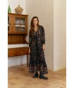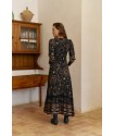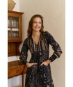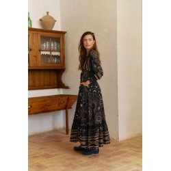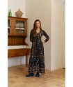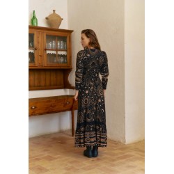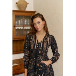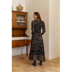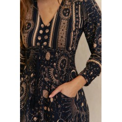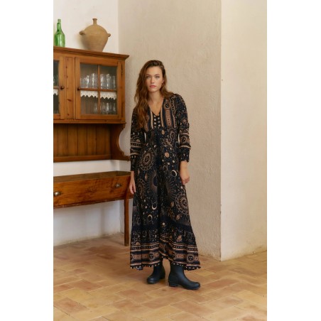 Vestido Astrid Sabrina de la marca Jaase. Vestido de manga larga, con base en color negro y estamapado en color dorado de motivos de astrología.