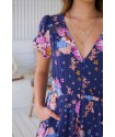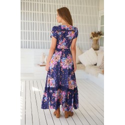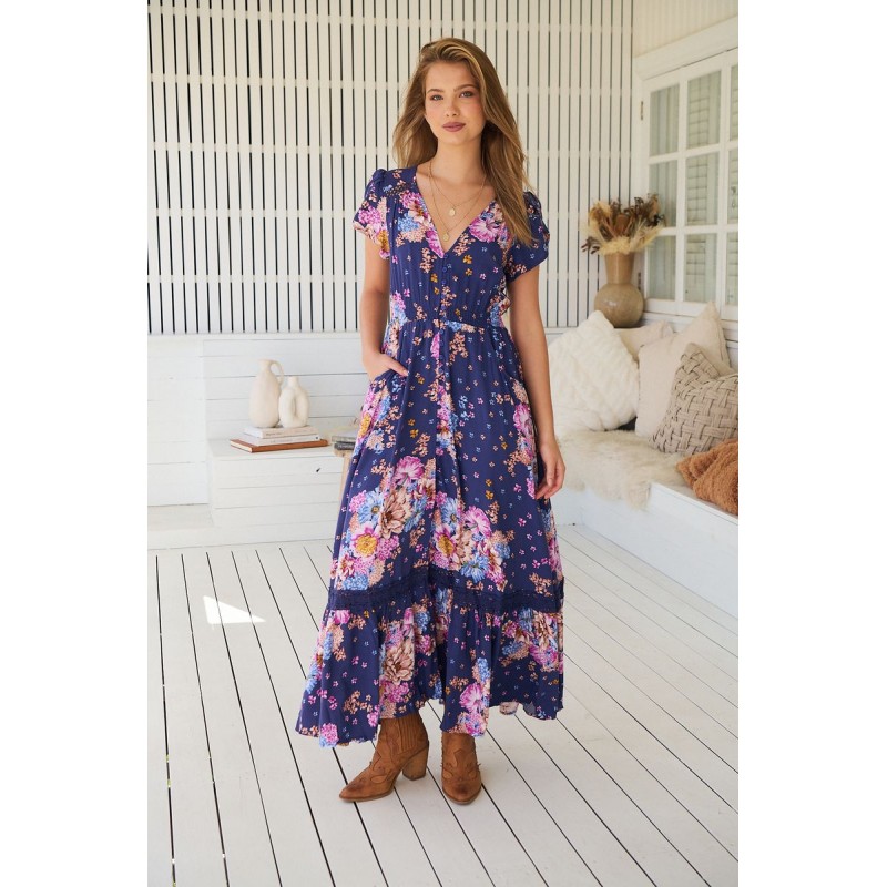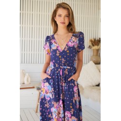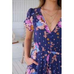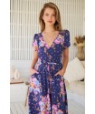 Vestido modelo Little Flowers Tabitha en corte maxi de la marca australiana Jaase. Vestido largo de manga corta con fondo en color azul y adornado con flores en tonos rosas. Con escote en pico y cierre de botones. Cintura fija en la parte delatera con elástico en la trasera. Dispone de bolsillos laterales.
