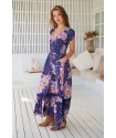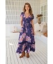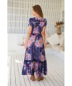 Vestido Wild Whim Carmen de Jaase. Vestido largo de manga corta tipo volante sobrepuesto con base en color morado con estampado de flores en tonos rosa, tostados y azul grandes y pequeñas.