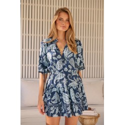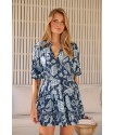 Vestido Midnight Bloom Navy Monroe de Jaase. Vestido corto de manga larga, con escote redondo cerrado con botones hasta el cuello. Vestido de cintura amplia, mangas largas con detalle de volante a media manga y acabadas en elastico. Vestido formado en volantes.