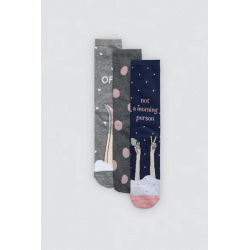 Pack regalo 3 calcetines not a morning person. Pack de 3 calcetines de caña alta con estampados graficos varidos, con puño antipresión que sujeta sin dejar marcas para un confort diario original. Presentados en un packaging especial ideal para regalar con estilo.